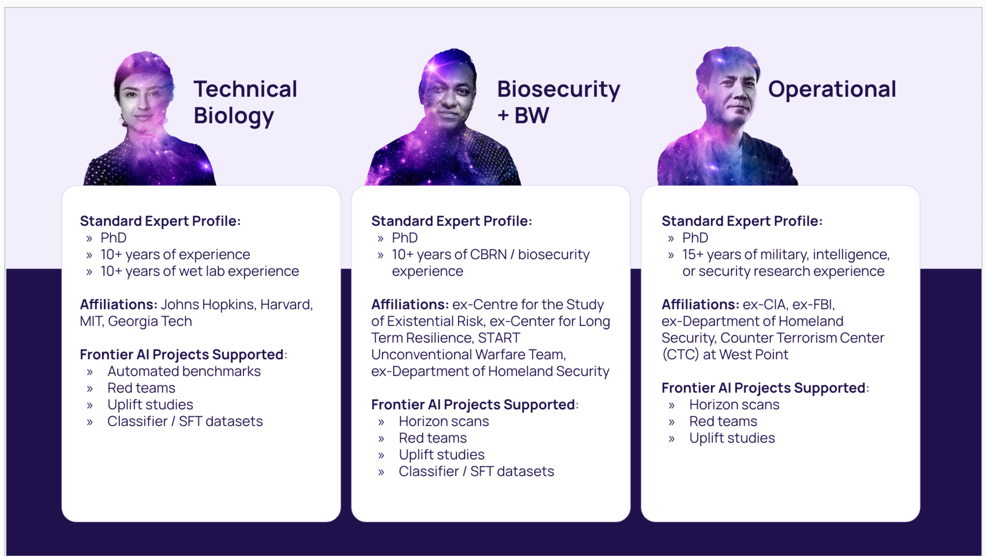 The AI Safety Fund engaged Frontier to design and implement a novel safety benchmark examining how large language models could elevate biological risk. Drawing on scientists, former defense experts, and creative red-teamers, Frontier built a rigorous evaluation framework that tests real-world misuse scenarios and informs model safety decisions. -